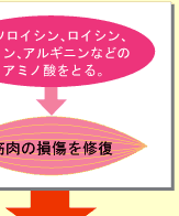 | すべてのアミノ酸が筋肉づくりに関わっていますが、その中でもとくに筋肉の合成を促したり、筋肉の分解を抑える働きをするのが、イソロイシン、ロイシン、バリンという3つのアミノ酸と、さらにグルタミン、アルギニンなどです。 また、基礎代謝の活性化には血液の循環も関係していますが、アルギニンというアミノ酸には血管拡張作用があるため、血流を改善し、基礎代謝のアップに有効だといわれています。もちろんたまごは、これらのアミノ酸をすべて含んでいるのです。