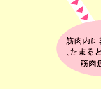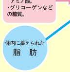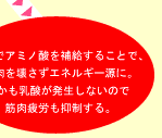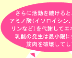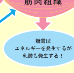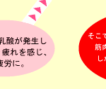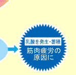 人間がからだを動かすためには、筋肉内でエネルギーをつくり出す必要があります。その源はグリコーゲンであり、ごはんなどに含まれる糖質からつくられます。グリコーゲンはエネルギーに変わる際、乳酸という物質を発生させます。この乳酸が筋肉内に蓄積されることで、筋肉疲労が起こるのです。「翌日まで疲れが抜けない」という場合、この乳酸が翌日まで残っていることが大きな原因といわれています。 |