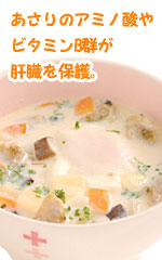 牛乳を少しずつ加えてなじませ、全部加えたらアサリを入れてひと煮し、たまごを割り入れ半熟状に仕上げる。器に盛り、パセリのみじん切りを散らす。 |