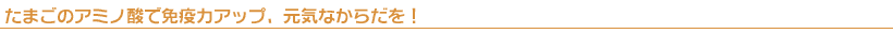 | 人間のからだには、外部から侵入してくるウイルスや細菌を撃退する「免疫」という機能が備わっています。たとえば、風邪をひくのは、体力の低下で免疫力が弱くなり、体内に侵入したウイルスを撃退できなくなることが原因です。ウイルスを撃退するのは、主に免疫細胞の働きによりますが、その働きを助けるのがアミノ酸のアルギニンとグルタミンです。 これらのアミノ酸が不足することによって起こる免疫力の低下は、風邪をはじめとする病気のほか、栄養失調、激しい運動などによって体力を消耗したときにも起こります。 日頃から、たまごで充分なアミノ酸を摂取して、風邪をひきにくい、また回復しやすいからだをつくっておくことが大切です。 |
