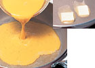 フライパンを熱し、バターを入れ、中火でバターがほとんど溶けたら、たまごを流し入れる。