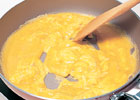 たまごを大きくかき混ぜ、半熟になる一歩手前で火から下ろす。余熱で固まりすぎないように注意を。