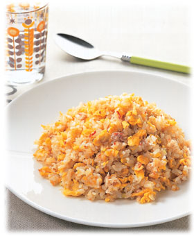 これは、卵黄に含まれる脂肪酸であるレシチンの働きによるもの。つまり、レシチンがごはんの水分と油を結びつける仲立ちをするために、クリーミィーなたまごがごはんの一粒一粒を包み込み、脂っこくなく、ふんわりパラパラのチャーハンに仕上げるのです。