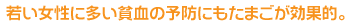 若い女性の貧血がよく問題になりますが、貧血とは主に血液中に含まれる赤血球数が異常に低下している状態をいいます。その原因としては、ダイエット、偏食、生理などのほかに、栄養不足があり、特に食物中の鉄分、たんぱく質、ビタミンB12・B6、葉酸などの不足と深くかかわっています。