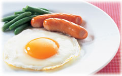 中火で焼く。好みの固さになったら塩、こしょうをふる。つけ合わせに、焼いたソーセージとゆでたさやいんげんを添える。