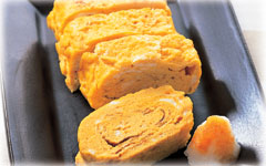 たまご焼き器を熱して油を敷き、卵液を少し流し入れて、半熟になったたまごを向こう側へよせ、空いたところに少量卵液を流し入れる。さらに、のり、チーズをのせ、手前から向こう側へ巻いていく。これを繰りかえす。