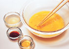 たまごは割りほぐし、だし汁、みりん、しょうゆ、塩を加えて混ぜ合わせる。