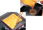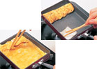 たまごが半熟になったら、向こう側から手前に巻いていく。同様にして残りの卵液もすべて焼く。