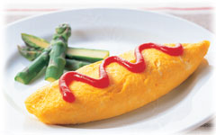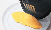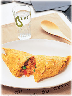 のライスの半量を中央に置いてたまごで包み、オムレツ形にして仕上げる。同様にして、もう1つ焼く。