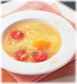 キャベツ、玉ねぎ、トマトをバターで炒める。水、コンソメ顆粒を加え、塩で味をととのえ、器に盛り、目玉焼きを加えて粗びきこしょうをふる。