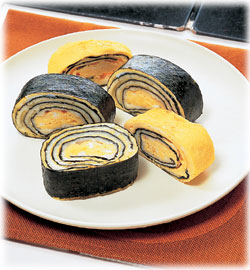 焼きあがったらたまご焼きにのりを巻いて、切り分ける。