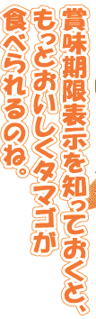 - 購入したタマゴはすぐに冷蔵庫へ。冷蔵庫は冷気が充分に庫内を循環するように、詰めすぎに注意を(入れる食品の目安は棚面積の60%程度)。
