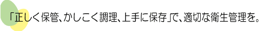 - 包丁、食器、まな板、ふきんなどは使用後洗剤と流水でよく洗い、特に生肉や魚を扱った調理器具は、その都度よく洗う。