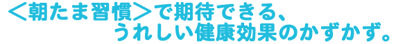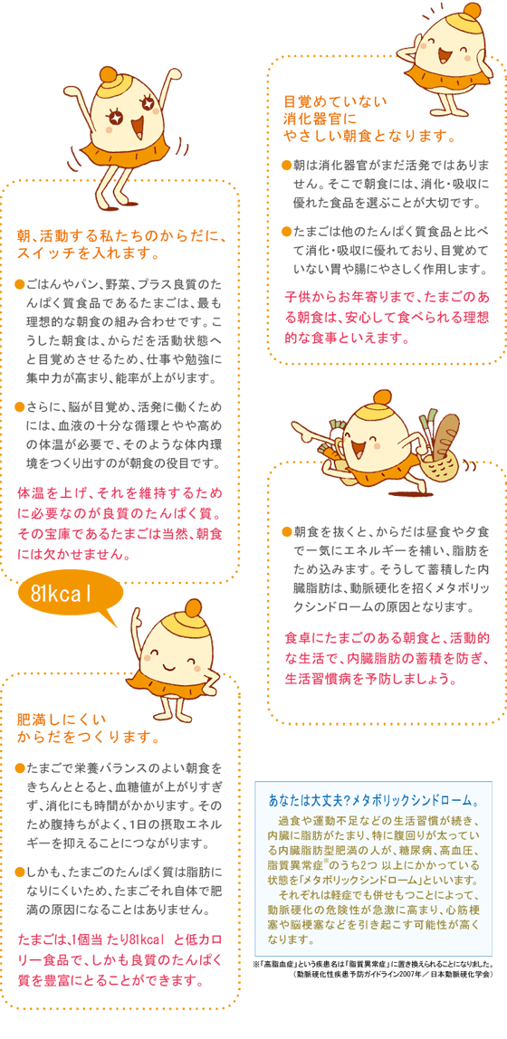 朝食を欠食する人は、常に食事の時間が不規則で、 食事の内容も偏りがちとの調査結果があります。 手軽で栄養満点な朝食メニューの強い味方"たまご"。 <朝たま習慣>には、こんなに多くの健康メリットがあります。