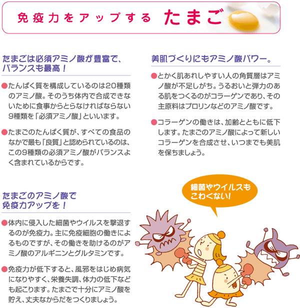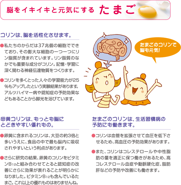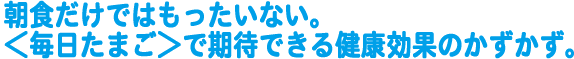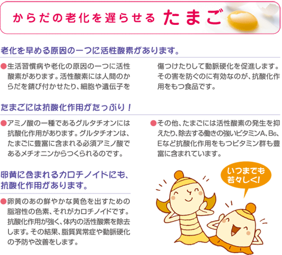 "最も完全に近い栄養食品"といわれるほど、 あらゆる栄養素がギュッと詰まっているたまご。 そのなかには、「からだの老化を遅らせる」 「脳をイキイキと元気にする」「免疫力を アップする」など、優れた栄養効果と機能性効果 のあることも明らかにされています。