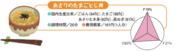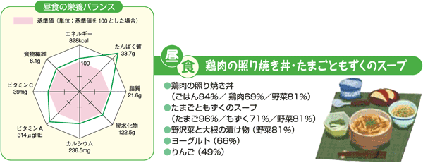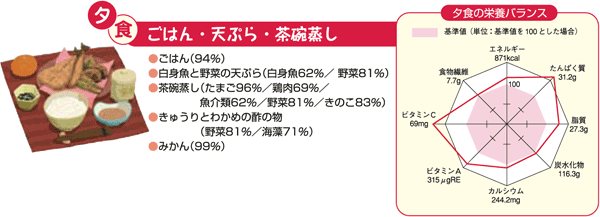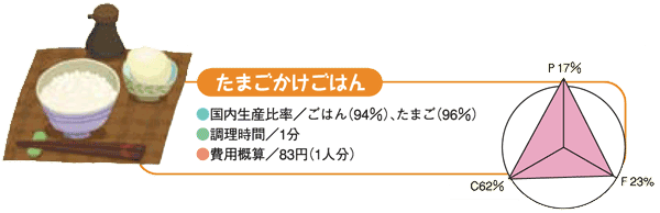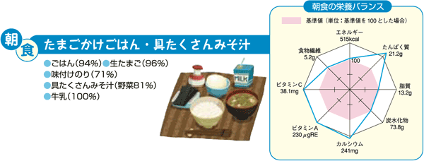 ●たまごや牛乳などで良質のたんぱく質やあらゆる栄養素を手軽にとれる。 ●季節ごとの緑黄色野菜や海草を豊富にとることができる。 ●エネルギーのとり過ぎを避け、適正な体重を維持できる。 ●脂肪、特に動物性脂肪のとり過ぎを避けられる。 |