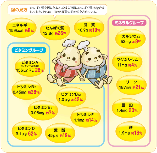 たまご2個に含まれるたんぱく質の量は、成人が1日に必要なたんぱく質の約26%にあたります。たんぱく質を構成している栄養素がアミノ酸。 このアミノ酸をはじめ、あらゆる栄養素を効率よく補給するためにも、1日に1~2個のたまごを摂ることが理想といえます。 |