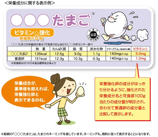 「鶏卵の表示に関する公正競争規約」の規則で定めている24種類の栄養成分のうち、その含有量が定めている量以上であるなどの条件をクリアすると、「栄養強化卵」と表示できます。