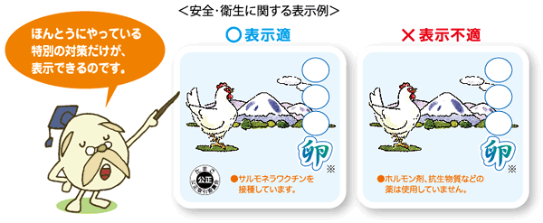 安全・衛生に関する表示をする場合は、下記の左図の表示のように、鶏や鶏舎に施している特別な対策を具体的に記します。右図のような通常行っている安全・衛生対策を、あたかも特別な対策であるような表示はできません。