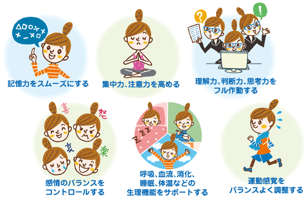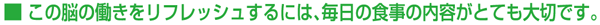 脳の神経細胞や神経線維、神経伝達物質は、食事からとる栄養成分でつくられ、これらを働かせるエネルギーも食事でまかなわれています。 脳の元気は、毎日の食生活によって、かなり個人差が出てきます。そこで、毎日の食事は、 ● 5大栄養素をバランスよく摂取する ● 脳の働きを活性化する栄養素や栄養成分をとり入れることが重要になります。 ※「脳の情報伝達のしくみ」については下のコラムをご参照ください。