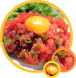 まぐろの赤身を包丁でたたいて細かく切ってボールに入れ、小口切りにした万能ねぎとごま油、しょうゆを加えてよく混ぜ、皿に盛って中央に生タマゴをのせる。