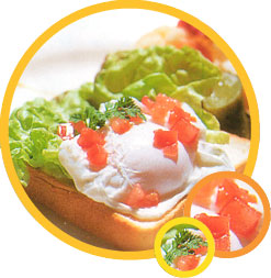 トーストしたパンにバター、マスタードを塗り、サラダ菜、(2)のポーチドエッグ、トマトをのせる。お好みでフライドポテトなどを添える。