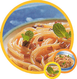 スパゲッティがゆで上がったら水気を切って、(1)の鍋に入れて火にかけ、一煮立ちしたら器に盛る。