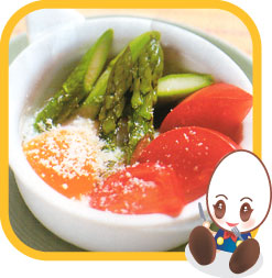 耐熱皿の内側にバターを薄くぬり、ゆでたグリーンアスパラ、くし型に切ったトマトを入れて、タマゴを割り入れ、電子レンジで1分、またはオーブントースターで3分程加熱し、粉チーズをふっていただく。