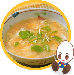 (1)に溶いたタマゴを線状に流し入れ、煮立つ前に火を止め、器に盛り、三つ葉とゆずを散らす。