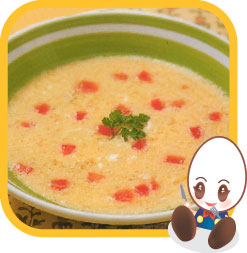 スープを一煮立ちさせたら、いったん火から下ろして、(1)を泡立て器で混ぜながら加え、再び弱火にかけ、プチトマトのみじん切りを加え、塩・こしょうで味をととのえ、器に盛る。