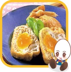 (1)に(4)を4等分して詰め、中にタマゴを1個ずつ割り入れてかんぴょうで結ぶ。