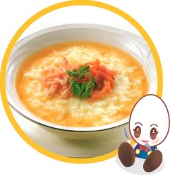 ごはんでおかゆを作り、出来上がったらといたタマゴをまぜて火を止め、器に盛ります。