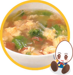 鍋に水とスープの素を入れ、煮立ったらえのきだけとトマトを加え、再び煮立ったらレタスを加えて調味し、溶きタマゴを流し入れる。