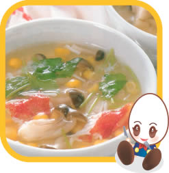 かには軟骨を除き、粗くほぐす。しめじは石づきを切り、ほぐす。コーンはもどし、みつばは2cm長さに切る。 |