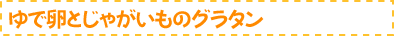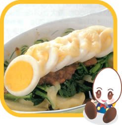 耐熱皿にミートソースの半量を敷き、じゃがいもを並べ、ほうれん草をのせて残りのミートソースをかける。上にゆで卵の輪切りをのせて、チーズをちらす。