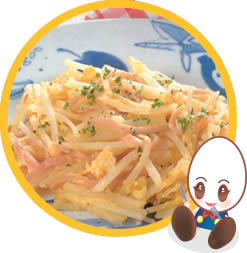 じゃがいもは皮をむき、5cm長さ、マッチ棒の太さに切り、水でさっと洗う。ハムも同様に切る。