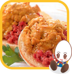 をよく混ぜ合わせておく。コンビーフは軽くほぐし、マフィンは半分に割って軽くトーストする。