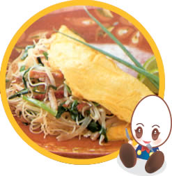を流し入れ、大きく混ぜながら、表面が半熟状になるまで火を通す。手前半分に(2)の具をのせ、たまごを二つ折りにかぶせ器に盛る。ライムと万能ネギを添える。