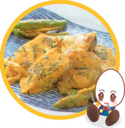 タラとししとうを(2)のたまご液にくぐらせ、サラダ油を熱したフライパンで焼く。残ったたまご液をまわしかけ、たまごに火が通ったら器に盛る。