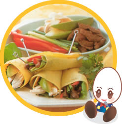 鶏肉が冷めたら手でさき、大葉、アボガドと一緒にたまごにのせ、Bを塗って巻く。 |