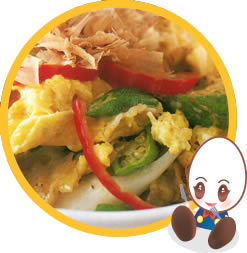 で味を調え、といておいたタマゴを入れて混ぜる。半熟になったら火を止めて器に盛り、おかかを散らす。
