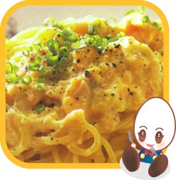 2 のゆで上がりに合わせて、フライパンに塩、こしょうを加えた生クリームを煮立て、1 を加え、軽く混ぜ火を止め、 2 にかける。