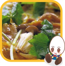 みつばを加えタマゴでとじて火を弱めてフタをする。タマゴが半熟になったら丼に盛ったごはんにのせる。